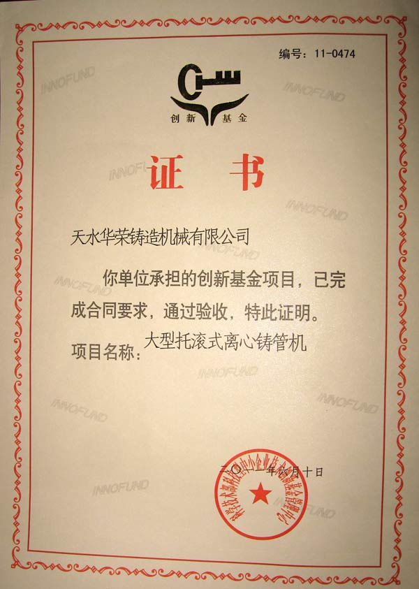 日前,天水華榮鑄造機械有限公司收到了國家科技部中小企業創新基金管理中心頒發的創新基金項目驗收合格證書,編號:11-0474,至此,天華鑄機承擔的“大型托滾式離心鑄管機”項目產品各項技術經濟指標達到合同要求,正式通過國家驗收。